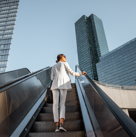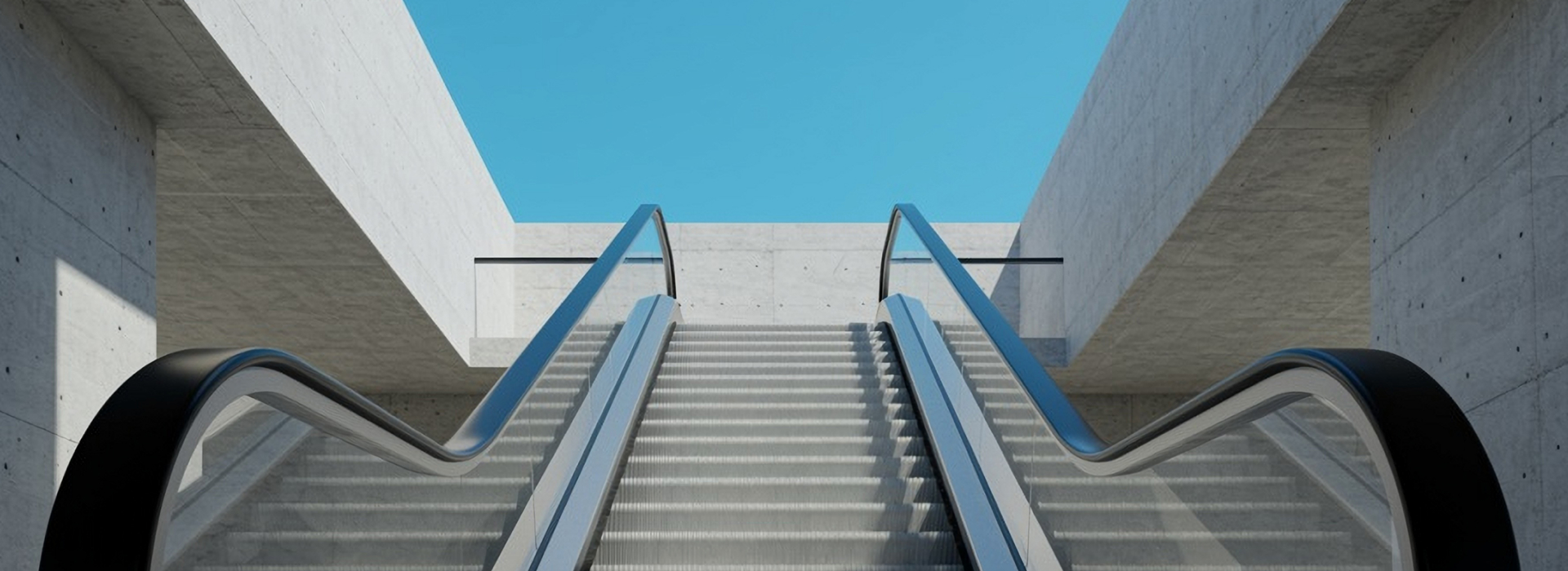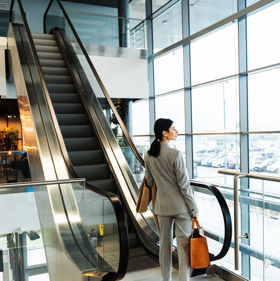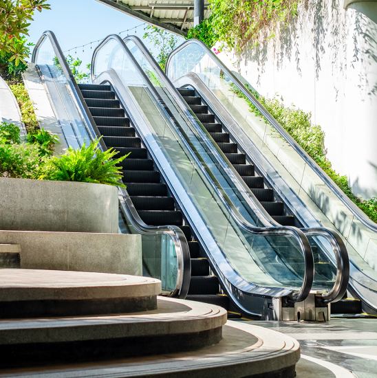 에스컬레이터는 수직 층 사이를 이동하는 역할을 하며, 일반적으로 30도에서 35도 각도로 설계됩니다.